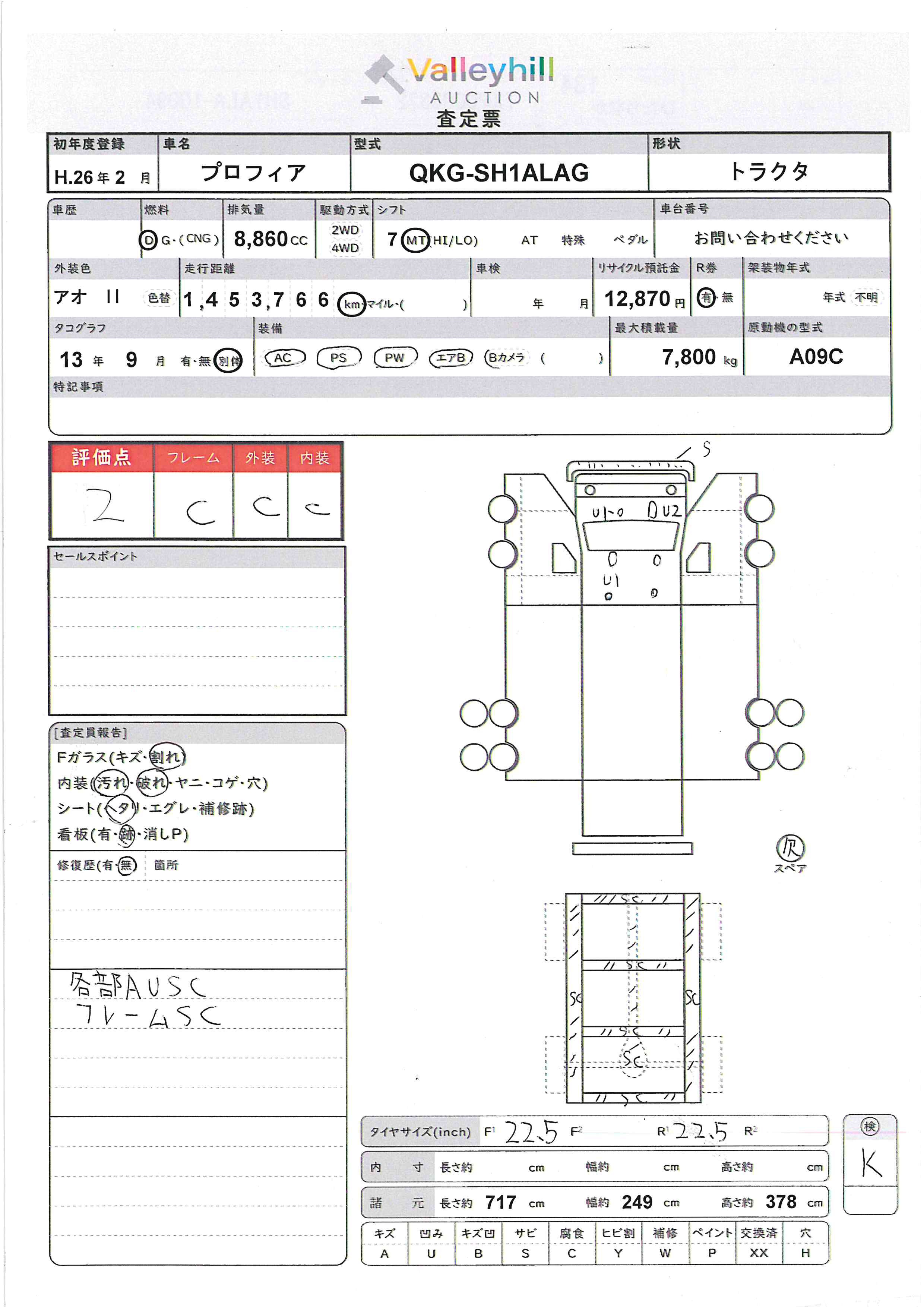 商品No. 5822 メーカー 日野 車名 プロフィア 型式 QKG-SH1ALAG 車両タイプ 大型 形状 トラクタ 評価 2評価について 現状販売 - 年式 2014年 燃料 ディーゼル 排気量 8860cc 走行距離 1453766km 車台番号 SH1ALA-1**** 原動機型式 A09C トランスミッション 7MT 保管場所 ひたちなか 備考 最大積載量 7800kg 車両重量 8040kg 車両総重量 15950kg 長さ(L) 717cm 幅(W) 249cm 高さ(H) 378cm 登録年月 2021年05月 製造年度 車両状態 稼働時間 車検期限 駆動方法 なし ハンドル 右 タコ年式 2013年09月 タイヤサイズ前 タイヤサイズ後 外装色 アオ II 内装色 ドア 定員 2 備考 - エアバッグ運転席
