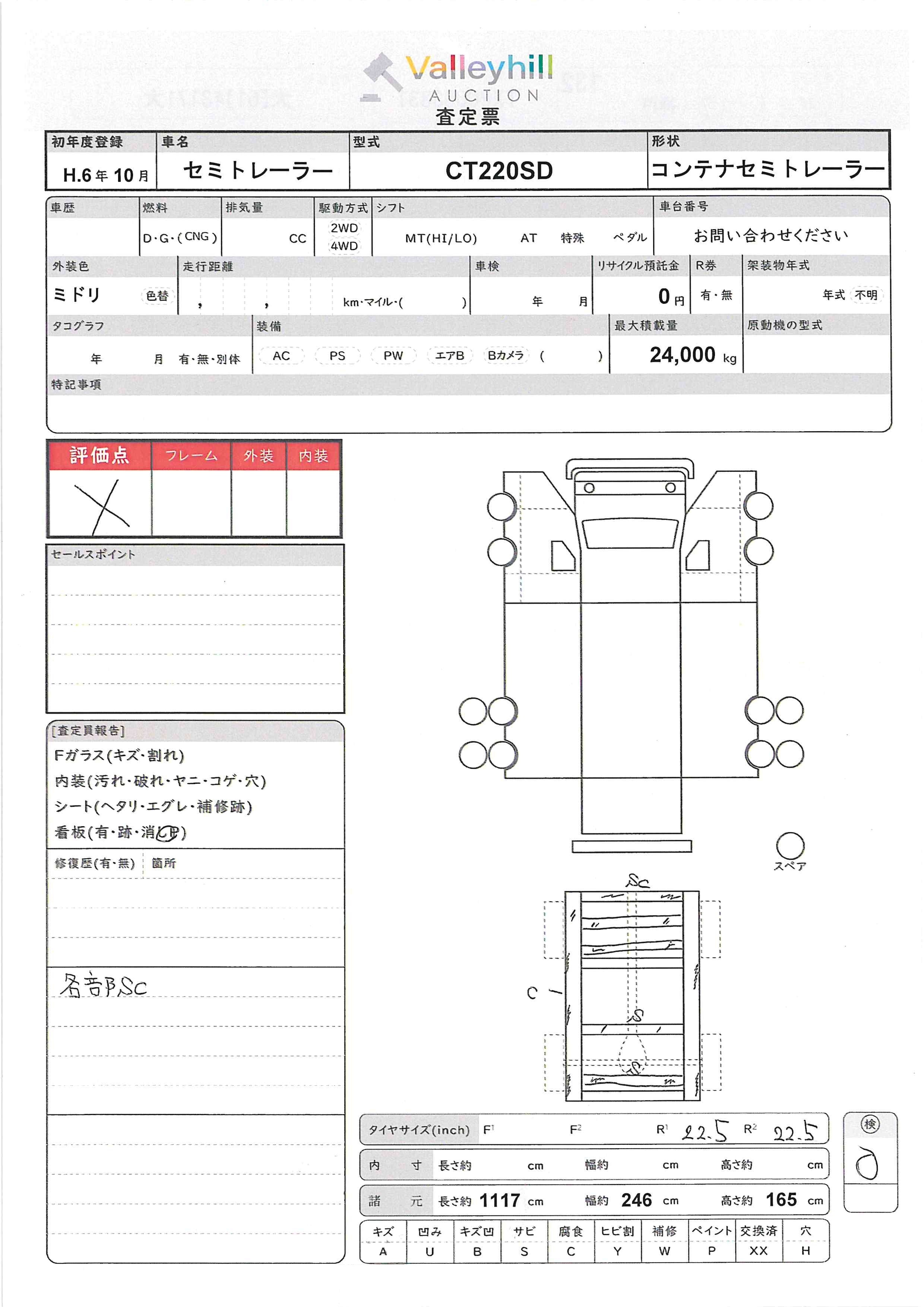 商品No. 5735 メーカー トレールモービル 車名 セミトレーラー 型式 CT220SD 車両タイプ 大型 形状 トレーラー 評価 X評価について 現状販売 現状車 年式 1994年 燃料 その他 排気量 走行距離 車台番号 大【61】43**** 原動機型式 トランスミッション なし 保管場所 神戸 備考 最大積載量 24000kg 車両重量 3880kg 車両総重量 27880kg 長さ(L) 1117cm 幅(W) 246cm 高さ(H) 165cm 登録年月 1994年10月 製造年度 車両状態 稼働時間 車検期限 駆動方法 なし ハンドル その他 タコ年式 タイヤサイズ前 タイヤサイズ後 外装色 ミドリ 内装色 ドア 定員 備考