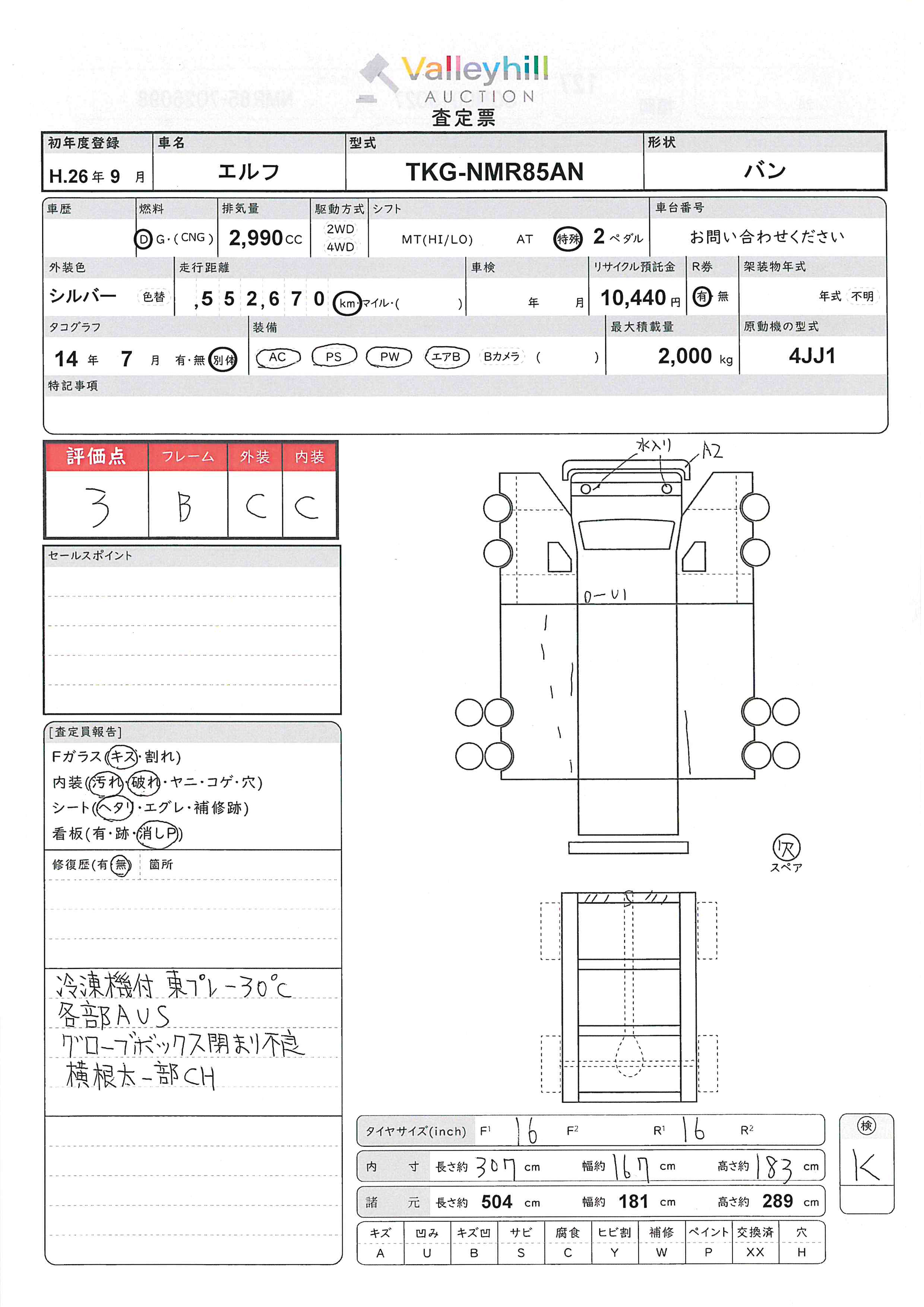 商品No. 5505 メーカー いすゞ 車名 エルフ 型式 TKG-NMR85AN 車両タイプ 小型 形状 バン 評価 3評価について 現状販売 - 年式 2014年 燃料 ディーゼル 排気量 2990cc 走行距離 552670km 車台番号 NMR85-702**** 原動機型式 4JJ1 トランスミッション AT 保管場所 福岡 備考 最大積載量 2000kg 車両重量 2930kg 車両総重量 5040kg 長さ(L) 504cm 幅(W) 181cm 高さ(H) 289cm 登録年月 2025年09月 製造年度 車両状態 稼働時間 車検期限 駆動方法 4x2 ハンドル 右 タコ年式 2014年07月 タイヤサイズ前 タイヤサイズ後 外装色 シルバー 内装色 ドア 定員 2 備考 - エアバッグ運転席