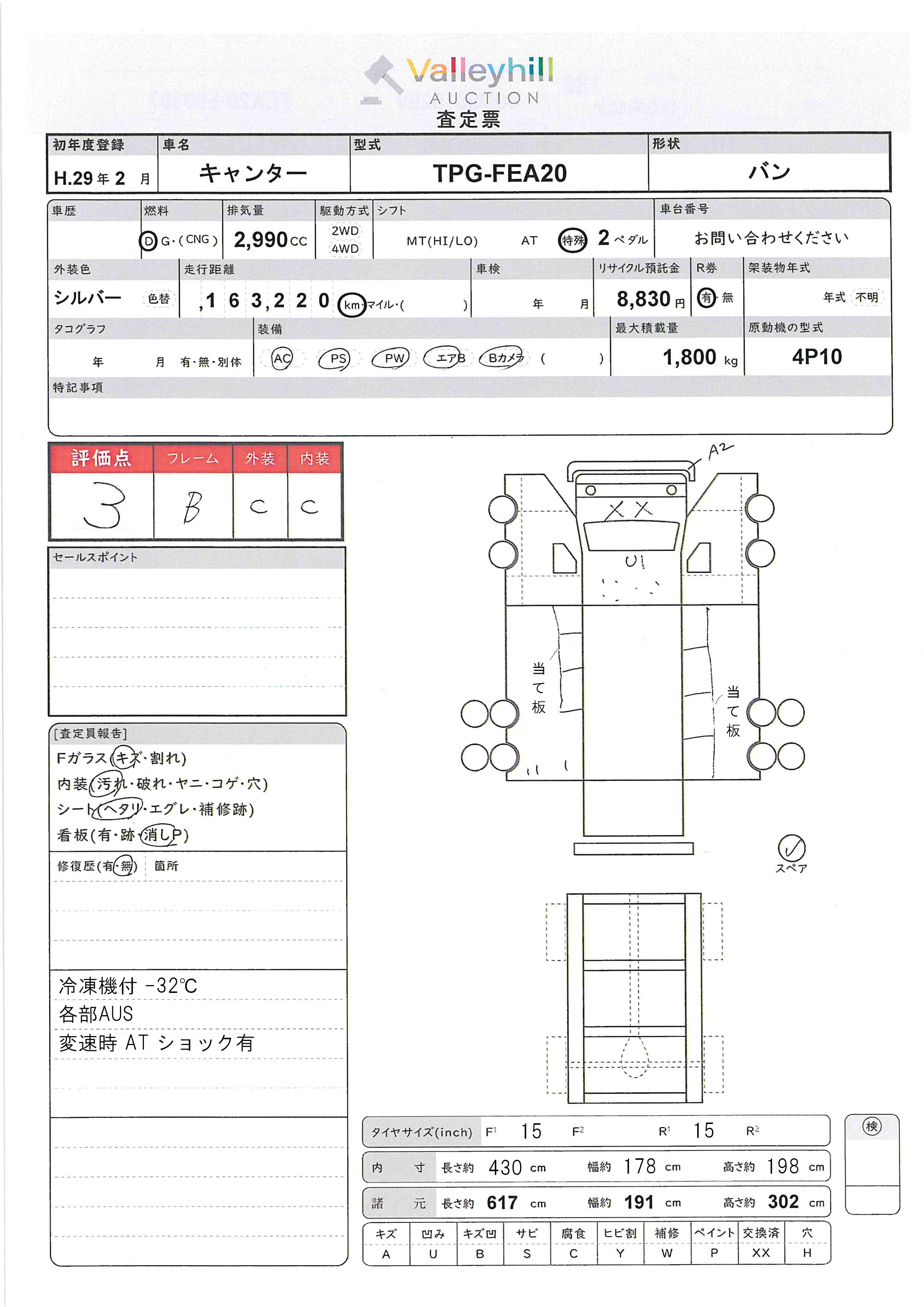 商品No. 5913 メーカー 三菱 車名 キャンター 型式 TPG-FEA20 車両タイプ 小型 形状 バン 評価 3評価について 現状販売 - 年式 2017年 燃料 ディーゼル 排気量 2990cc 走行距離 163220km 車台番号 FEA20-55**** 原動機型式 4P10 トランスミッション AT 保管場所 ひたちなか 備考 最大積載量 1800kg 車両重量 車両総重量 長さ(L) 617cm 幅(W) 191cm 高さ(H) 302cm 登録年月 製造年度 車両状態 稼働時間 車検期限 駆動方法 4x2 ハンドル 右 タコ年式 タイヤサイズ前 タイヤサイズ後 外装色 シルバー 内装色 ドア 定員 備考 - エアバッグ運転席
