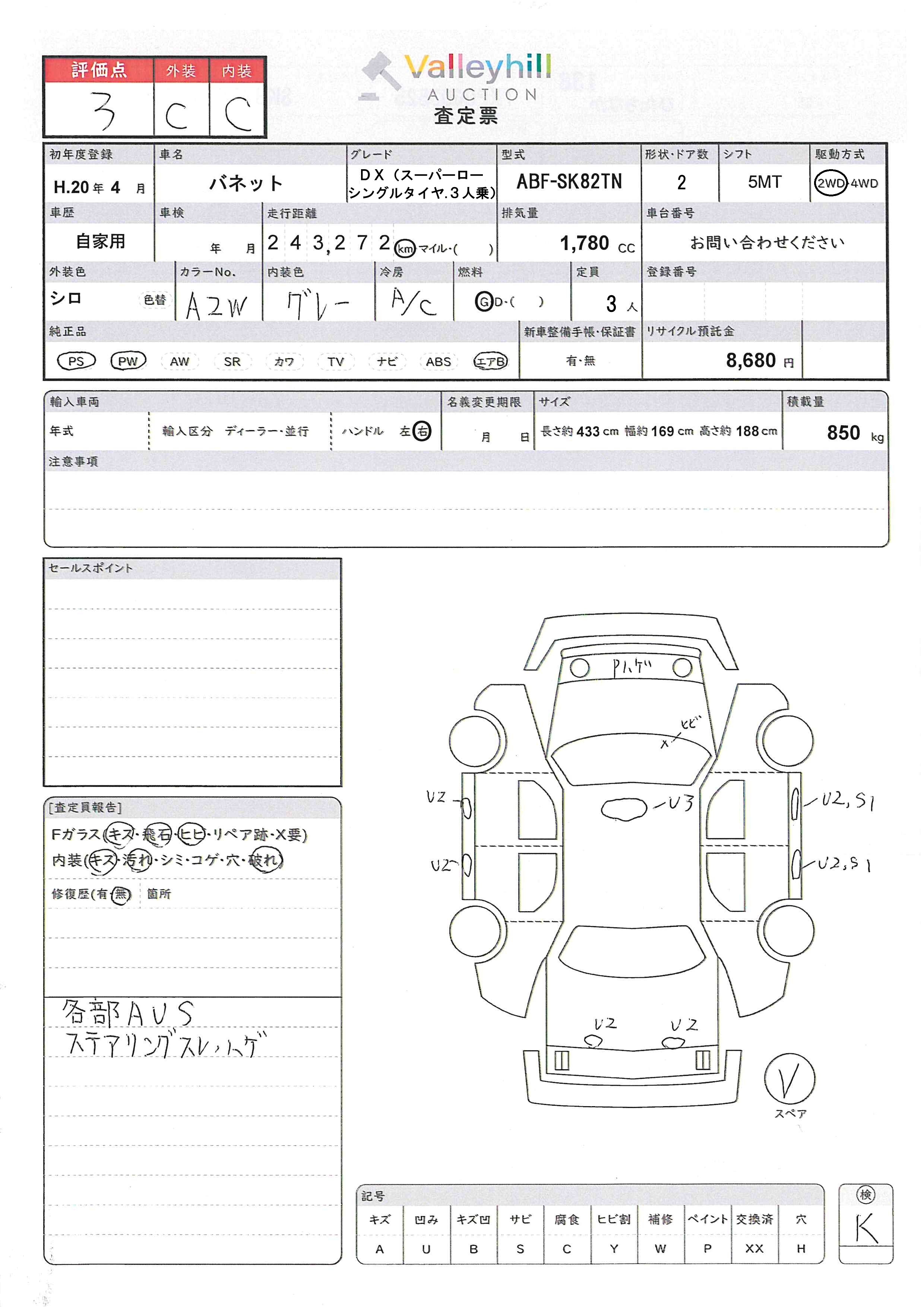 商品No. 5998 メーカー 日産 車名 バネット 型式 ABF-SK82TN 車両タイプ 小型 形状 キャブオーバ 評価 3評価について 現状販売 - 年式 2008年 燃料 ガソリン 排気量 1780cc 走行距離 243272km 車台番号 SK82TN-40**** 原動機型式 F8 トランスミッション 5MT 保管場所 ひたちなか 備考 最大積載量 850kg 車両重量 1300kg 車両総重量 2315kg 長さ(L) 433cm 幅(W) 169cm 高さ(H) 188cm 登録年月 2008年04月 製造年度 車両状態 稼働時間 車検期限 駆動方法 4x2 ハンドル 右 タコ年式 タイヤサイズ前 タイヤサイズ後 外装色 シロ 内装色 ドア 定員 3 備考 - エアバッグ運転席