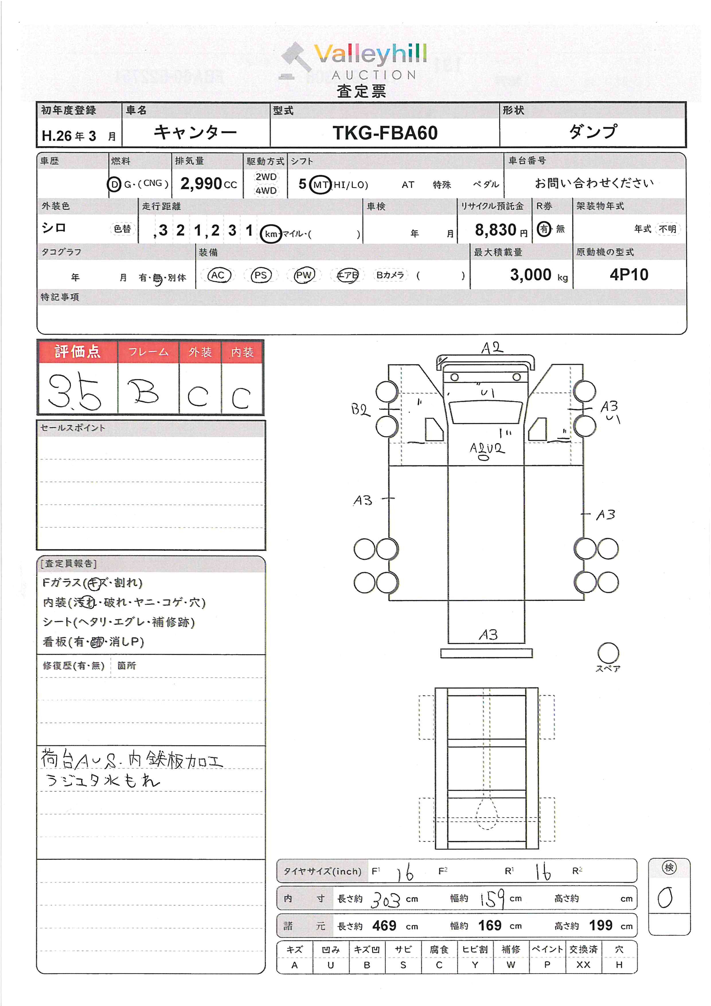商品No. 5695 メーカー 三菱 車名 キャンター 型式 TKG-FBA60 車両タイプ 小型 形状 ダンプ 評価 3.5評価について 現状販売 - 年式 2014年 燃料 ディーゼル 排気量 2990cc 走行距離 321231km 車台番号 FBA60-52**** 原動機型式 TKG-FBA60 トランスミッション 5MT 保管場所 神戸 備考 最大積載量 3000kg 車両重量 2920kg 車両総重量 6085kg 長さ(L) 469cm 幅(W) 169cm 高さ(H) 199cm 登録年月 2025年01月 製造年度 車両状態 稼働時間 車検期限 駆動方法 4x2 ハンドル 右 タコ年式 タイヤサイズ前 タイヤサイズ後 外装色 シロ 内装色 ドア 定員 3 備考 - エアバッグ運転席