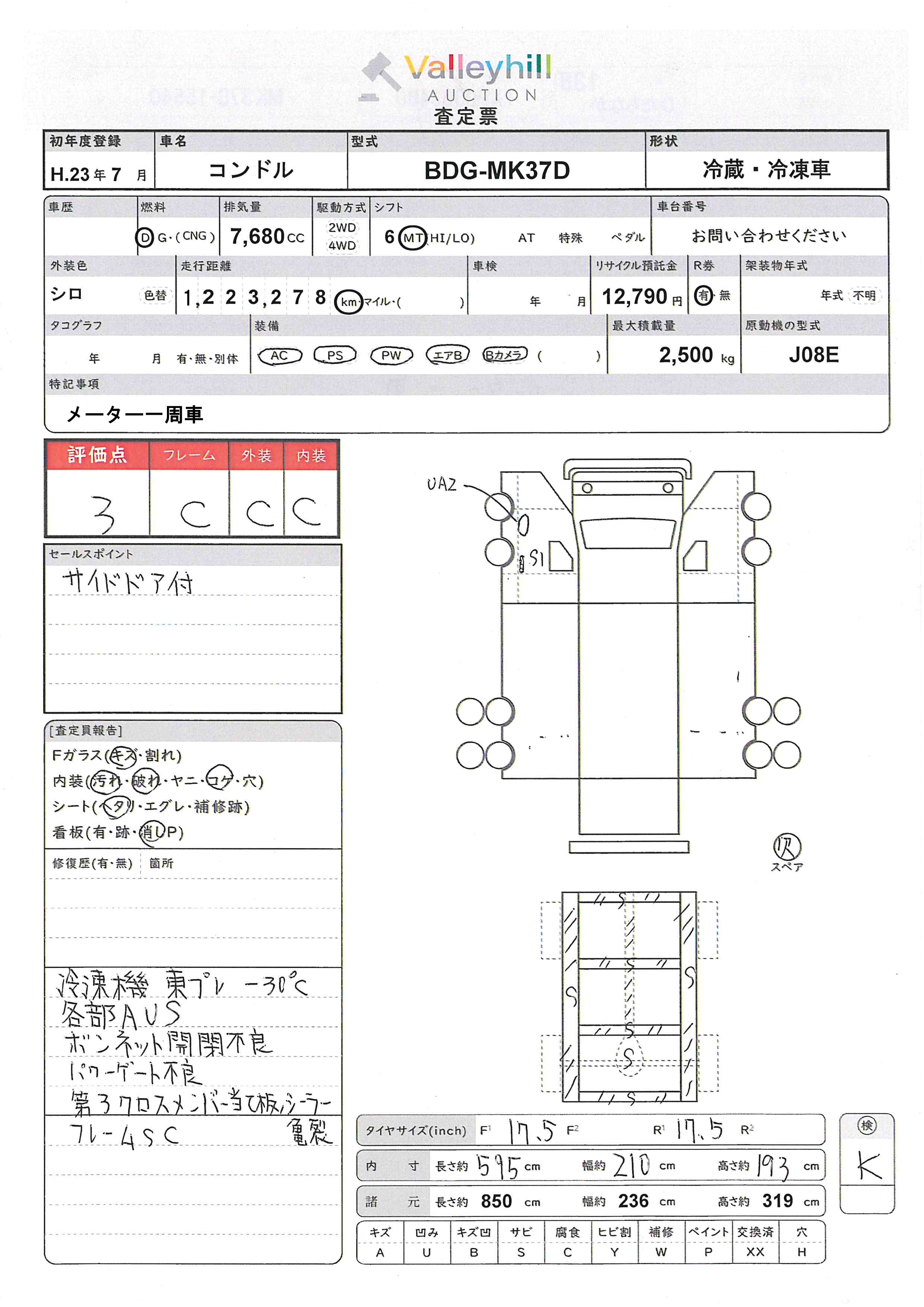 商品No. 5996 メーカー UDトラックス 車名 コンドル 型式 BDG-MK37D 車両タイプ 小型特殊 形状 冷蔵・冷凍車 評価 3評価について 現状販売 - 年式 2011年 燃料 ディーゼル 排気量 7680cc 走行距離 1223278km 車台番号 MK37D-1**** 原動機型式 J08E トランスミッション 6MT 保管場所 ひたちなか 備考 最大積載量 2500kg 車両重量 5360kg 車両総重量 7970kg 長さ(L) 850cm 幅(W) 236cm 高さ(H) 319cm 登録年月 2016年09月 製造年度 車両状態 稼働時間 車検期限 駆動方法 4x2 ハンドル 右 タコ年式 タイヤサイズ前 タイヤサイズ後 外装色 シロ 内装色 ドア 定員 2 備考 - エアバッグ運転席