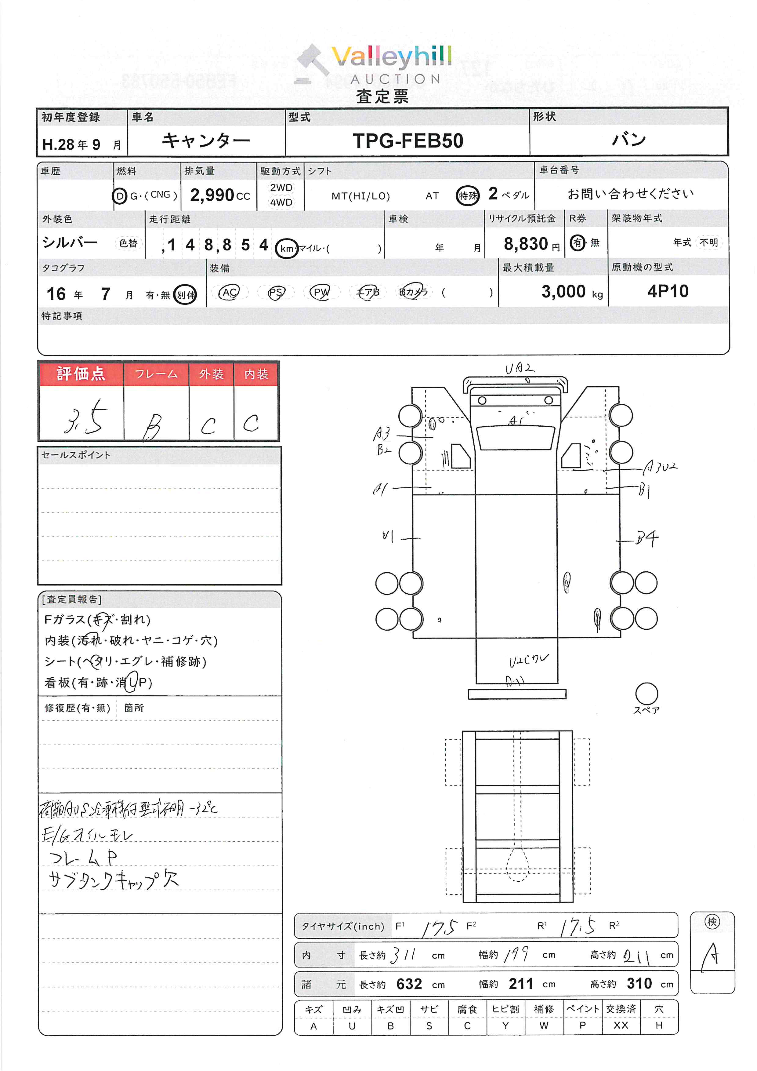 商品No. 5473 メーカー 三菱 車名 キャンター 型式 TPG-FEB50 車両タイプ 小型 形状 バン 評価 3.5評価について 現状販売 - 年式 2016年 燃料 ディーゼル 排気量 2990cc 走行距離 148854km 車台番号 FEB50-55**** 原動機型式 4P10 トランスミッション AT 保管場所 ひたちなか 備考 最大積載量 3000kg 車両重量 3350kg 車両総重量 6460kg 長さ(L) 632cm 幅(W) 211cm 高さ(H) 310cm 登録年月 2025年09月 製造年度 車両状態 稼働時間 車検期限 駆動方法 4x2 ハンドル 右 タコ年式 2016年07月 タイヤサイズ前 タイヤサイズ後 外装色 シルバー 内装色 ドア 定員 2 備考 - エアバッグ運転席