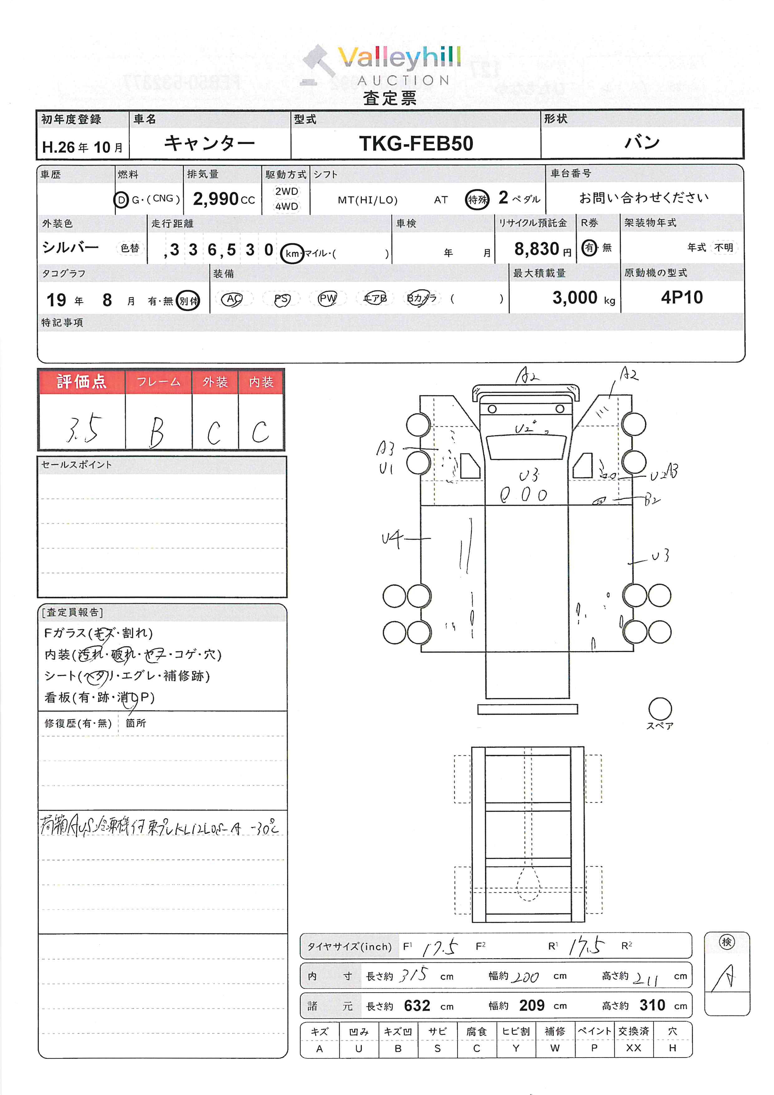 商品No. 5472 メーカー 三菱 車名 キャンター 型式 TKG-FEB50 車両タイプ 小型 形状 バン 評価 3.5評価について 現状販売 - 年式 2014年 燃料 ディーゼル 排気量 2990cc 走行距離 336530km 車台番号 FEB50-53**** 原動機型式 4P10 トランスミッション AT 保管場所 ひたちなか 備考 最大積載量 3000kg 車両重量 3320kg 車両総重量 6430kg 長さ(L) 632cm 幅(W) 209cm 高さ(H) 310cm 登録年月 2025年09月 製造年度 車両状態 稼働時間 車検期限 駆動方法 4x2 ハンドル 右 タコ年式 2019年08月 タイヤサイズ前 タイヤサイズ後 外装色 シルバー 内装色 ドア 定員 2 備考 - エアバッグ運転席
