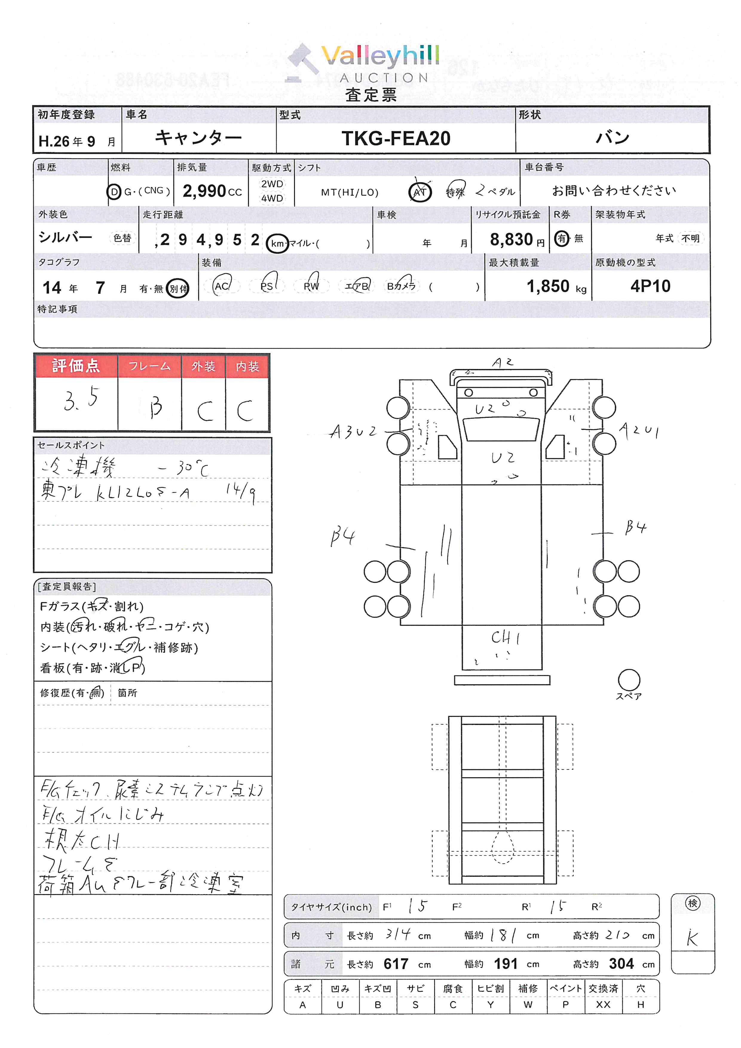 商品No. 5422 メーカー 三菱 車名 キャンター 型式 TKG-FEA20 車両タイプ 小型 形状 バン 評価 3.5評価について 現状販売 - 年式 2014年 燃料 ディーゼル 排気量 2990cc 走行距離 294952km 車台番号 FEA20-53**** 原動機型式 4P10 トランスミッション AT 保管場所 ひたちなか 備考 最大積載量 1850kg 車両重量 車両総重量 長さ(L) 617cm 幅(W) 191cm 高さ(H) 304cm 登録年月 製造年度 車両状態 稼働時間 車検期限 駆動方法 4x2 ハンドル 右 タコ年式 2014年07月 タイヤサイズ前 タイヤサイズ後 外装色 内装色 ドア 定員 備考 - エアバッグ運転席