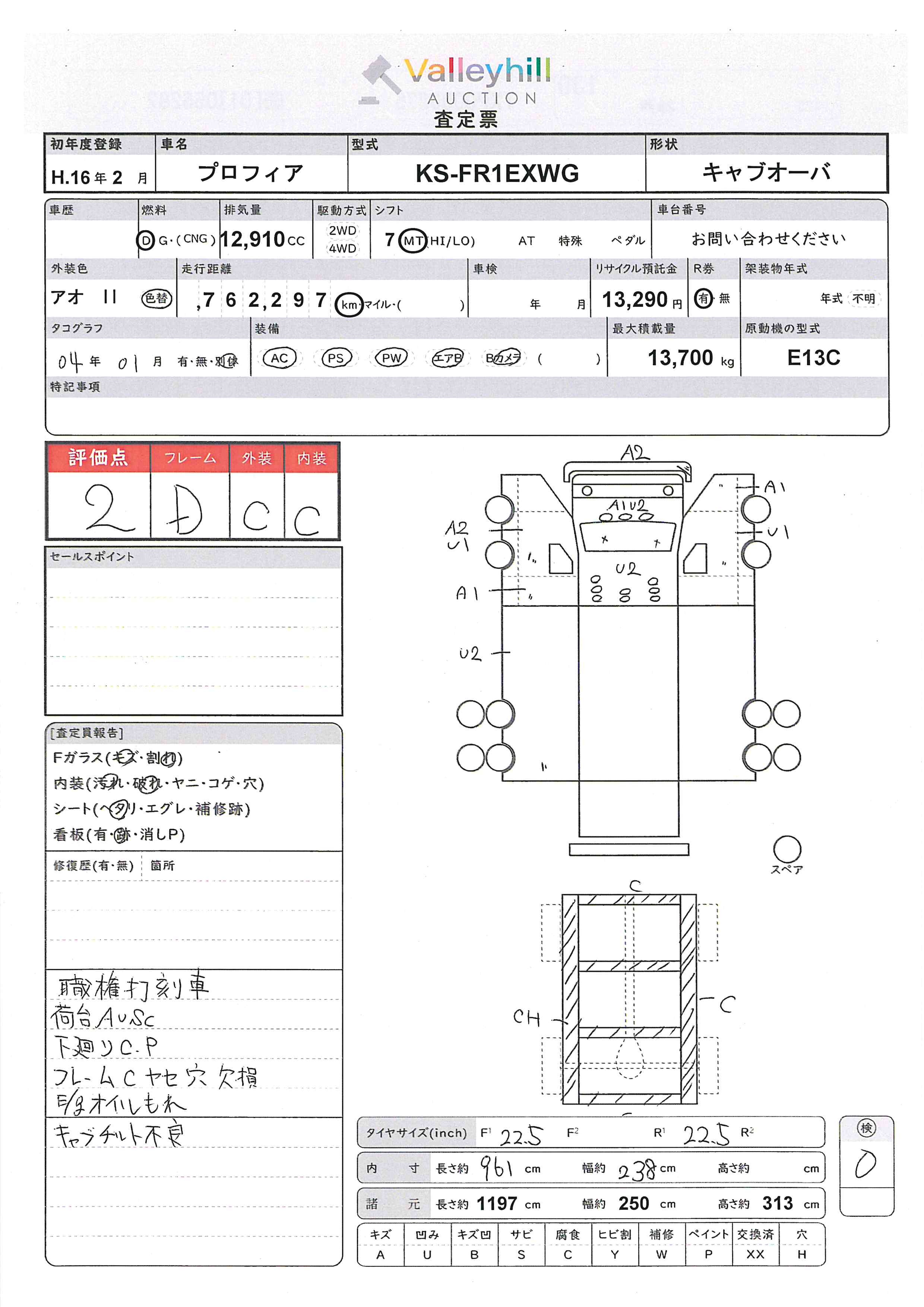 商品No. 5652 メーカー 日野 車名 プロフィア 型式 KS-FR1EXWG 車両タイプ 大型 形状 キャブオーバ 評価 2評価について 現状販売 - 年式 2004年 燃料 ディーゼル 排気量 12910cc 走行距離 762297km 車台番号 国[01]05**** 原動機型式 E13C トランスミッション 7MT 保管場所 神戸 備考 最大積載量 13700kg 車両重量 11130kg 車両総重量 24940kg 長さ(L) 1197cm 幅(W) 250cm 高さ(H) 313cm 登録年月 2023年09月 製造年度 車両状態 稼働時間 車検期限 駆動方法 なし ハンドル 右 タコ年式 2004年01月 タイヤサイズ前 タイヤサイズ後 外装色 アオ II 内装色 ドア 定員 2 備考 - エアバッグ運転席