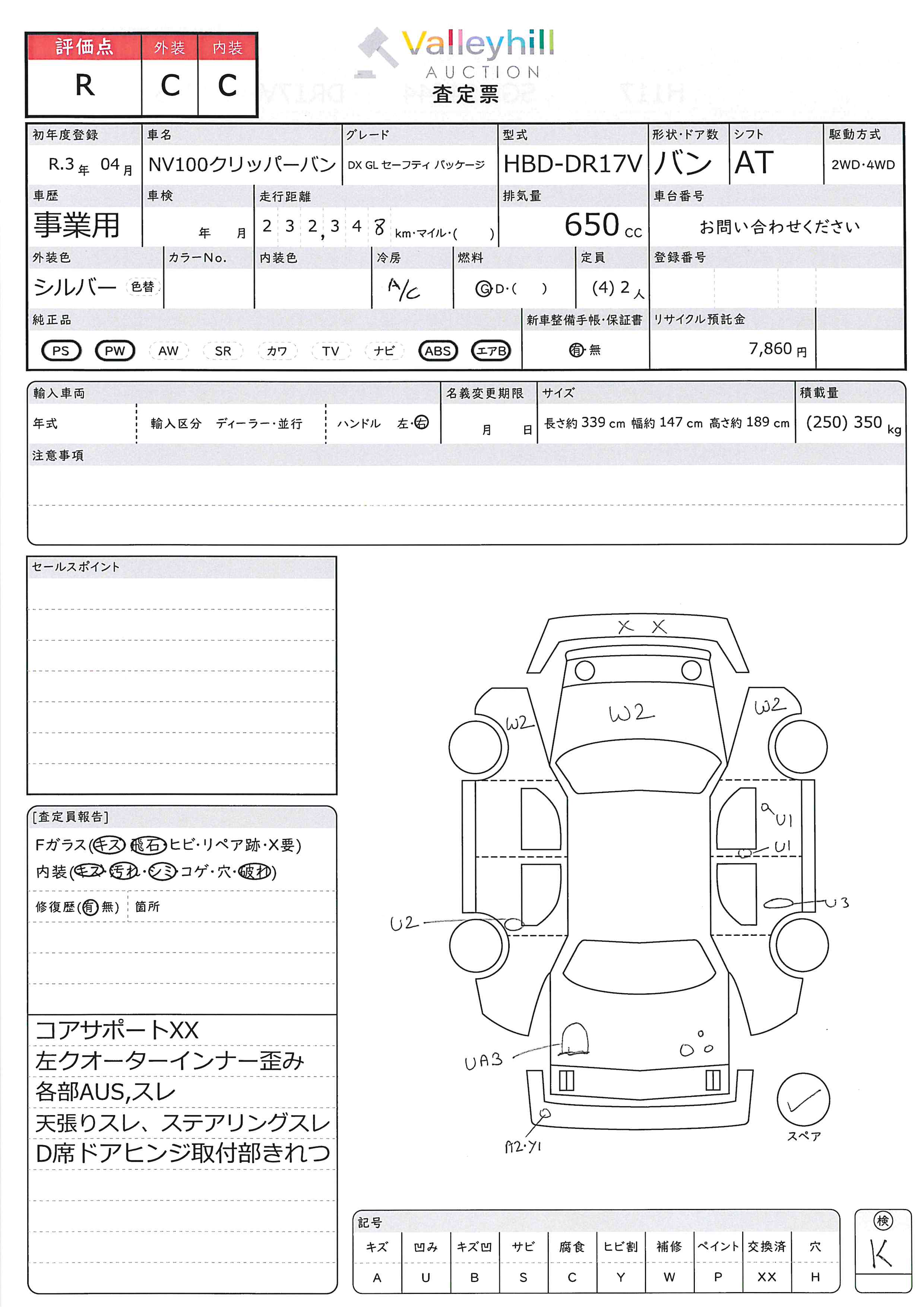 商品No. 4960 メーカー 日産 車名 NV100 クリッパーバン 型式 HBD-DR17V 車両タイプ 小型 形状 バン 評価 R評価について 現状販売 - 年式 2021年 燃料 ガソリン 排気量 0.65cc 走行距離 232348km 車台番号 DR17V-46**** 原動機型式 R06A トランスミッション AT 保管場所 ひたちなか 備考 事業用 最大積載量 350kg 車両重量 870kg 車両総重量 1330kg 長さ(L) 339cm 幅(W) 147cm 高さ(H) 189cm 登録年月 2025年04月 製造年度 車両状態 稼働時間 車検期限 駆動方法 4x2 ハンドル 右 タコ年式 2020年01月 タイヤサイズ前 タイヤサイズ後 外装色 シルバー 内装色 ドア 定員 (4) 2 備考 事業用 - エアバッグ運転席