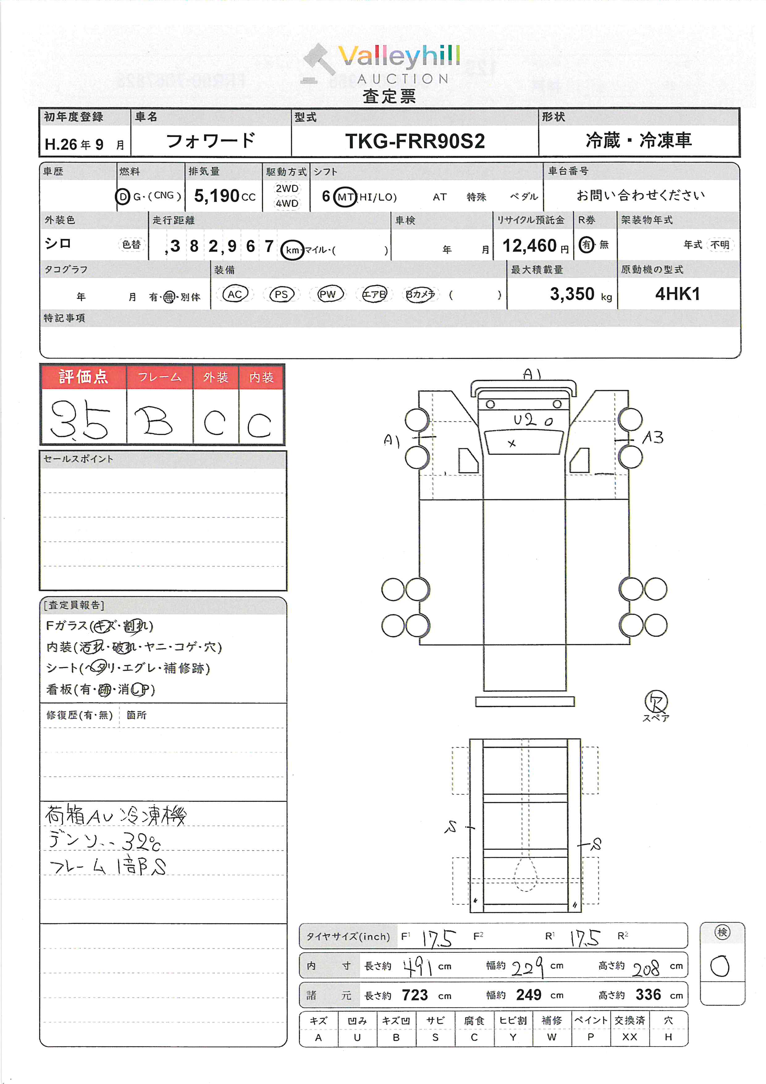 商品No. 5590 メーカー いすゞ 車名 フォワード 型式 TKG-FRR90S2 車両タイプ 大型 形状 冷蔵・冷凍車 評価 3.5評価について 現状販売 - 年式 2014年 燃料 ディーゼル 排気量 5190cc 走行距離 382967km 車台番号 FRR90-706**** 原動機型式 4HK1 トランスミッション 6MT 保管場所 神戸 備考 最大積載量 3350kg 車両重量 4530kg 車両総重量 7990kg 長さ(L) 723cm 幅(W) 249cm 高さ(H) 336cm 登録年月 2014年09月 製造年度 車両状態 稼働時間 車検期限 駆動方法 4x2 ハンドル 右 タコ年式 タイヤサイズ前 タイヤサイズ後 外装色 シロ 内装色 ドア 定員 2 備考 - エアバッグ運転席