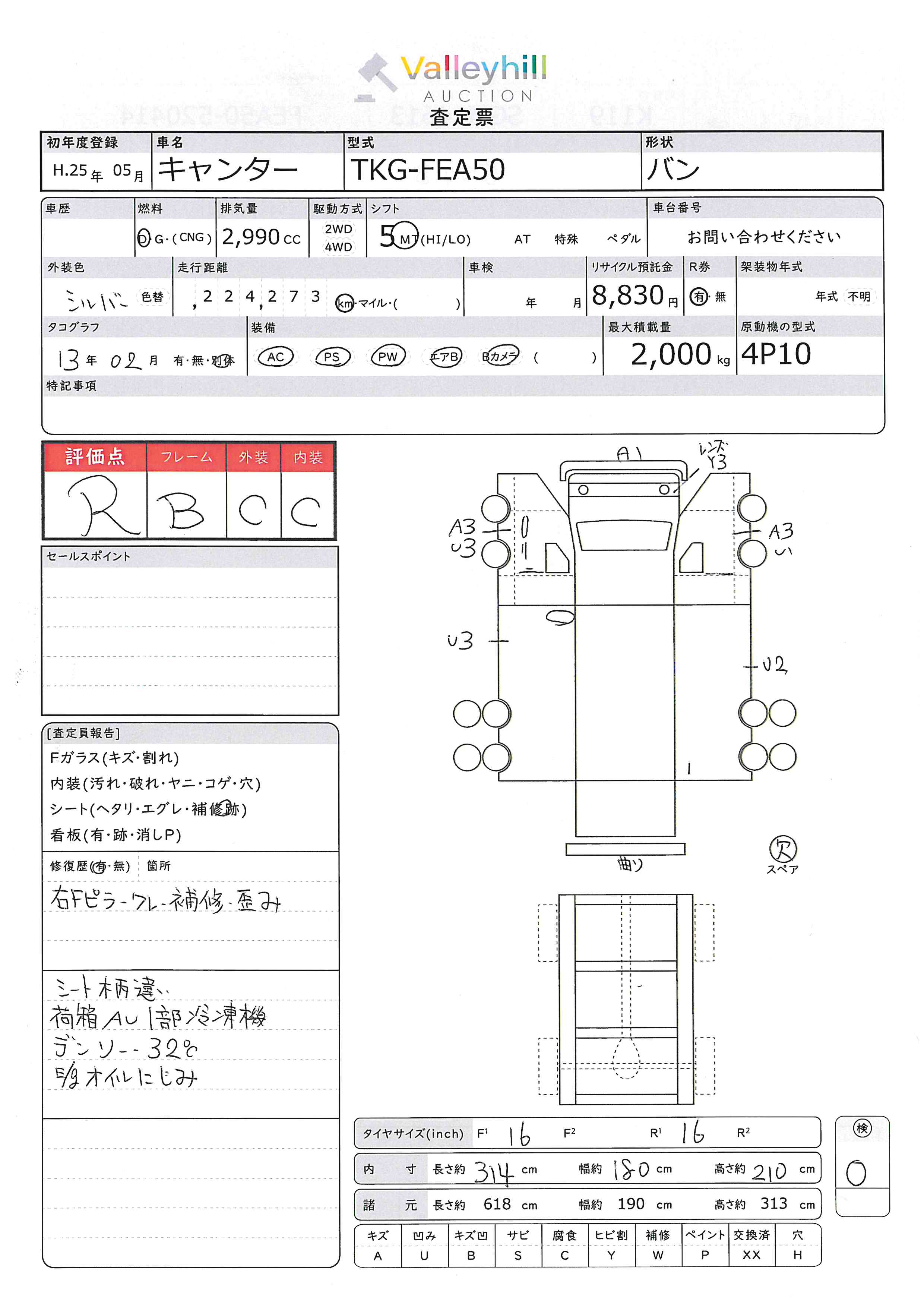 商品No. 5048 メーカー 三菱 車名 キャンター 型式 TKG-FEA50 車両タイプ 小型 形状 バン 評価 R評価について 現状販売 - 年式 2013年 燃料 ディーゼル 排気量 2990cc 走行距離 224273km 車台番号 FEA50-52**** 原動機型式 4P10 トランスミッション 5MT 保管場所 神戸 備考 最大積載量 2000kg 車両重量 3190kg 車両総重量 5300kg 長さ(L) 618cm 幅(W) 190cm 高さ(H) 313cm 登録年月 2025年05月 製造年度 車両状態 稼働時間 車検期限 駆動方法 4x2 ハンドル 右 タコ年式 2013年02月 タイヤサイズ前 タイヤサイズ後 外装色 シルバー 内装色 ドア 定員 2 備考 - エアバッグ運転席