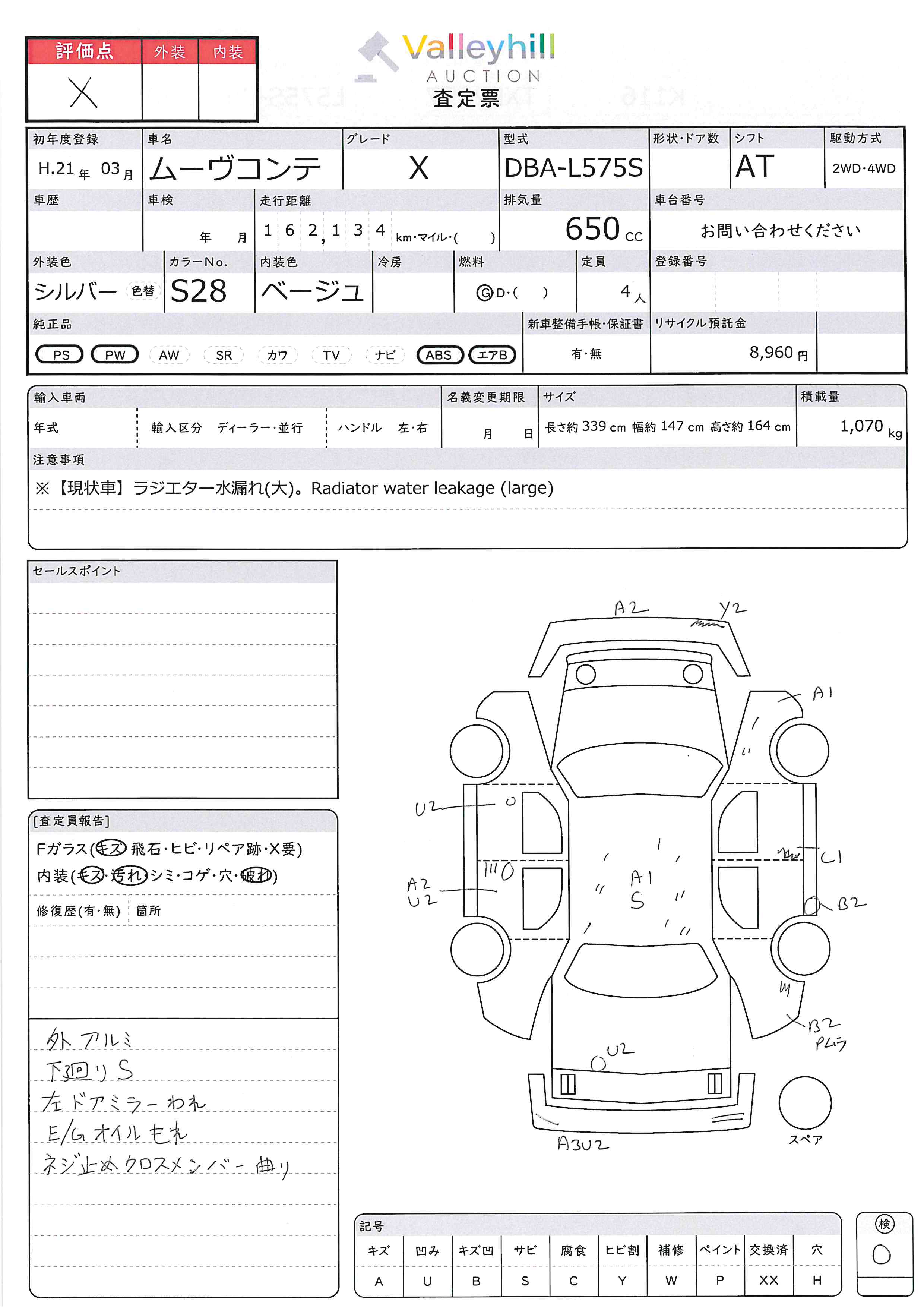 商品No. 4907 メーカー ダイハツ 車名 ムーヴ コンテ 型式 DBA-L575S 車両タイプ 小型 形状 乗用車 評価 X評価について 現状販売 現状車 年式 2009年 燃料 ガソリン 排気量 650cc 走行距離 162134km 車台番号 L575S-003**** 原動機型式 KF トランスミッション AT 保管場所 神戸 備考 最大積載量 車両重量 850kg 車両総重量 1070kg 長さ(L) 339cm 幅(W) 147cm 高さ(H) 164cm 登録年月 2022年10月 製造年度 車両状態 稼働時間 車検期限 駆動方法 4x2 ハンドル 右 タコ年式 タイヤサイズ前 タイヤサイズ後 外装色 シルバ- 内装色 ドア 定員 4 備考 - エアバッグ運転席