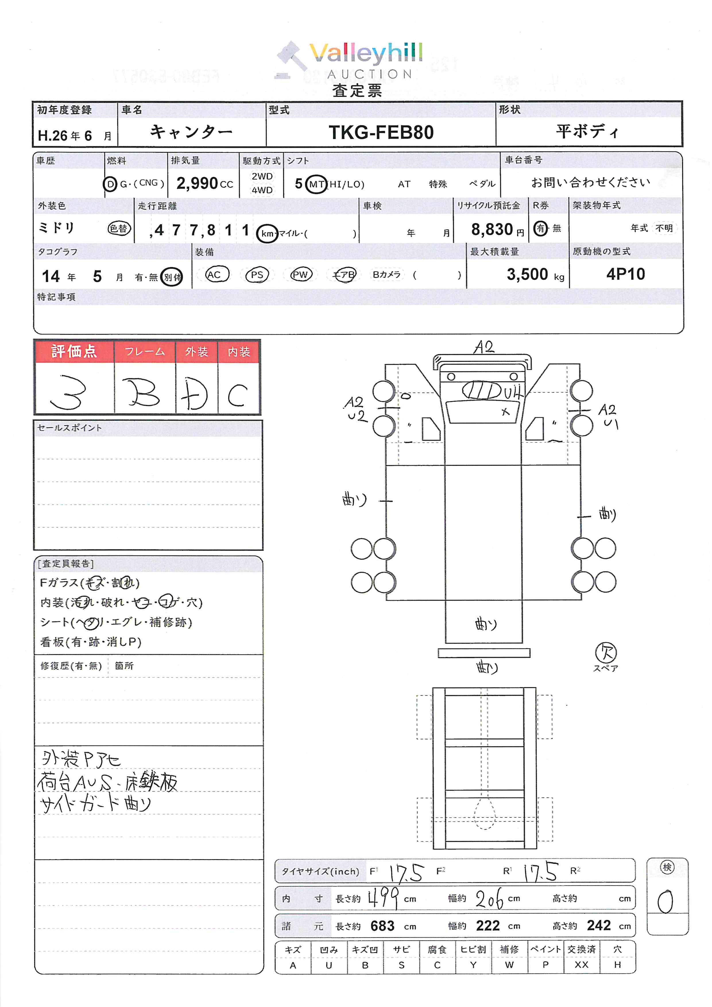 商品No. 5364 メーカー 三菱 車名 キャンター 型式 TKG-FEB80 車両タイプ 小型 形状 平ボディ 評価 3評価について 現状販売 - 年式 2014年 燃料 ディーゼル 排気量 2990cc 走行距離 477811km 車台番号 FEB80-53**** 原動機型式 4P10 トランスミッション 5MT 保管場所 神戸 備考 最大積載量 3500kg 車両重量 3000kg 車両総重量 6665kg 長さ(L) 683cm 幅(W) 222cm 高さ(H) 242cm 登録年月 2025年07月 製造年度 車両状態 稼働時間 車検期限 駆動方法 4x2 ハンドル 右 タコ年式 2014年05月 タイヤサイズ前 タイヤサイズ後 外装色 ミドリ 内装色 ドア 定員 3 備考 - エアバッグ運転席