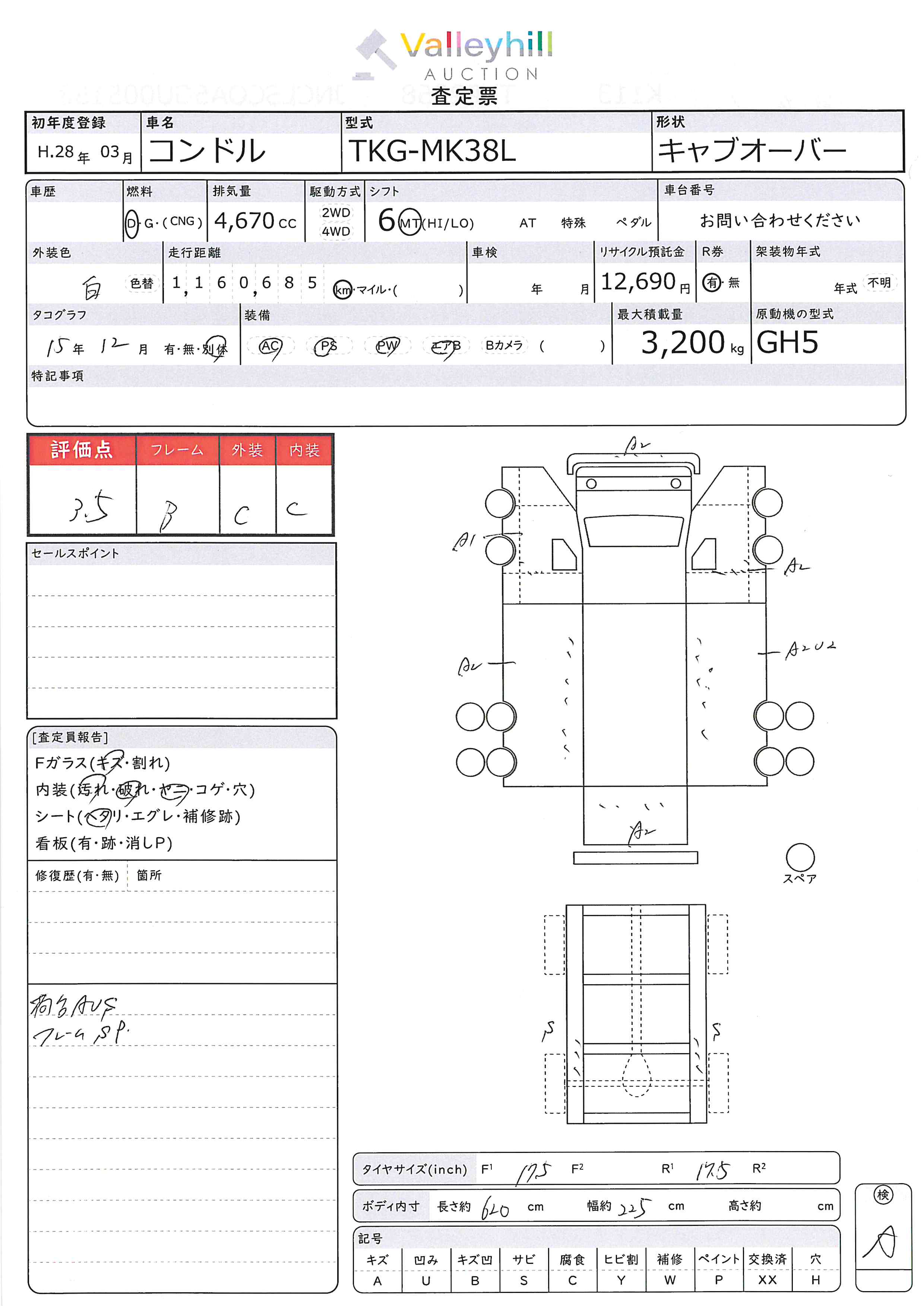 商品No. 4771 メーカー UDトラックス 車名 コンドル 型式 TKG-MK38L 車両タイプ 大型 形状 キャブオーバ 評価 3.5評価について 現状販売 - 年式 2016年 燃料 ディーゼル 排気量 4670cc 走行距離 1160685km 車台番号 JNCLSC0A5GU00**** 原動機型式 GH5 トランスミッション 6MT 保管場所 神戸 備考 最大積載量 3200kg 車両重量 4680kg 車両総重量 7990kg 長さ(L) 850cm 幅(W) 236cm 高さ(H) 298cm 登録年月 2021年06月 製造年度 車両状態 稼働時間 車検期限 駆動方法 4x2 ハンドル 右 タコ年式 2015年12月 タイヤサイズ前 タイヤサイズ後 外装色 白 内装色 ドア 定員 2 備考 - エアバッグ運転席