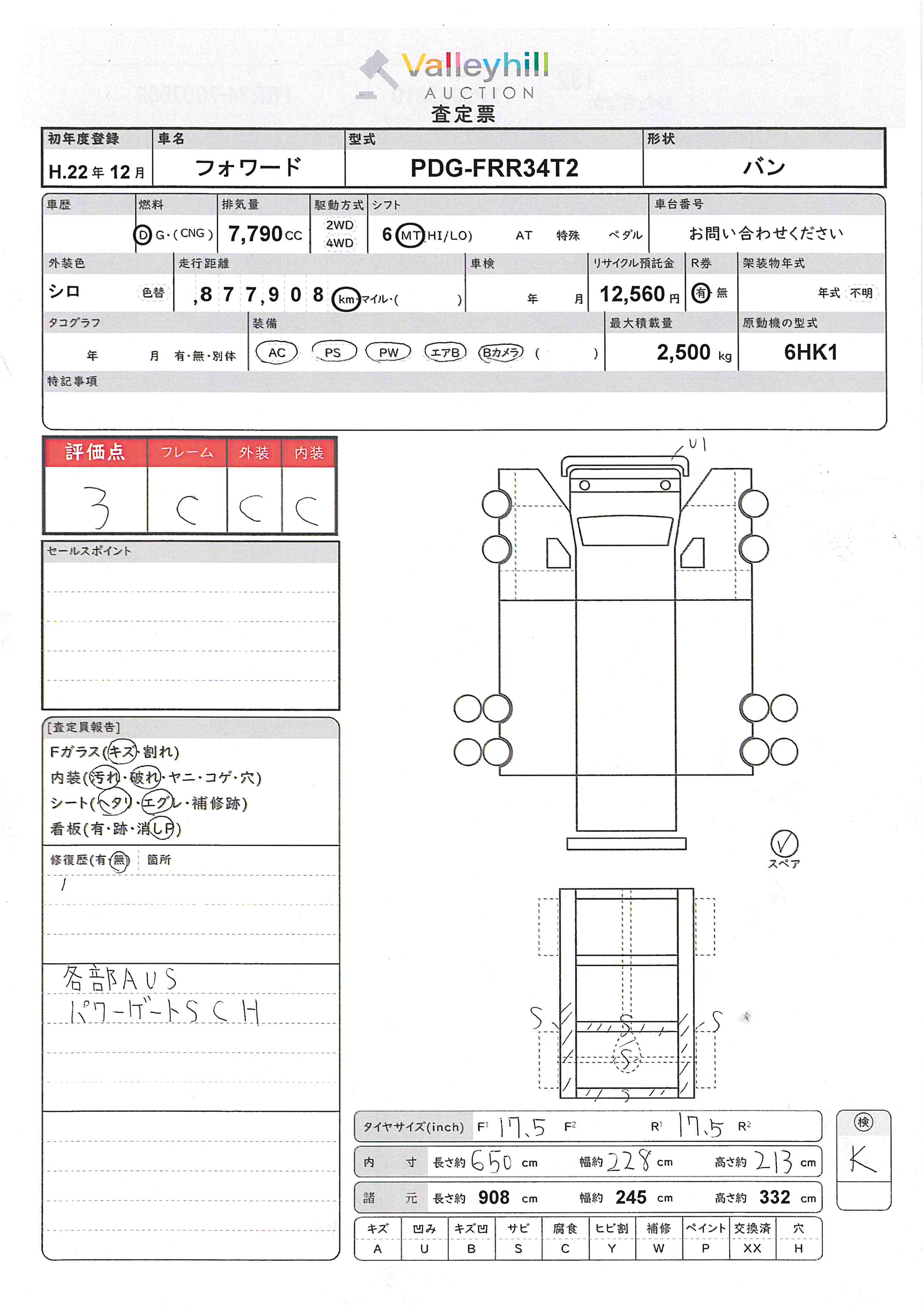 商品No. 5741 メーカー いすゞ 車名 フォワード 型式 PDG-FRR34T2 車両タイプ 大型 形状 バン 評価 3評価について 現状販売 - 年式 2010年 燃料 ディーゼル 排気量 7790cc 走行距離 877908km 車台番号 FRR34-700**** 原動機型式 6HK1 トランスミッション 6MT 保管場所 ひたちなか 備考 最大積載量 2500kg 車両重量 5330kg 車両総重量 7995kg 長さ(L) 908cm 幅(W) 245cm 高さ(H) 332cm 登録年月 2010年12月 製造年度 車両状態 稼働時間 車検期限 駆動方法 4x2 ハンドル 右 タコ年式 タイヤサイズ前 タイヤサイズ後 外装色 シロ 内装色 ドア 定員 3 備考 - エアバッグ運転席