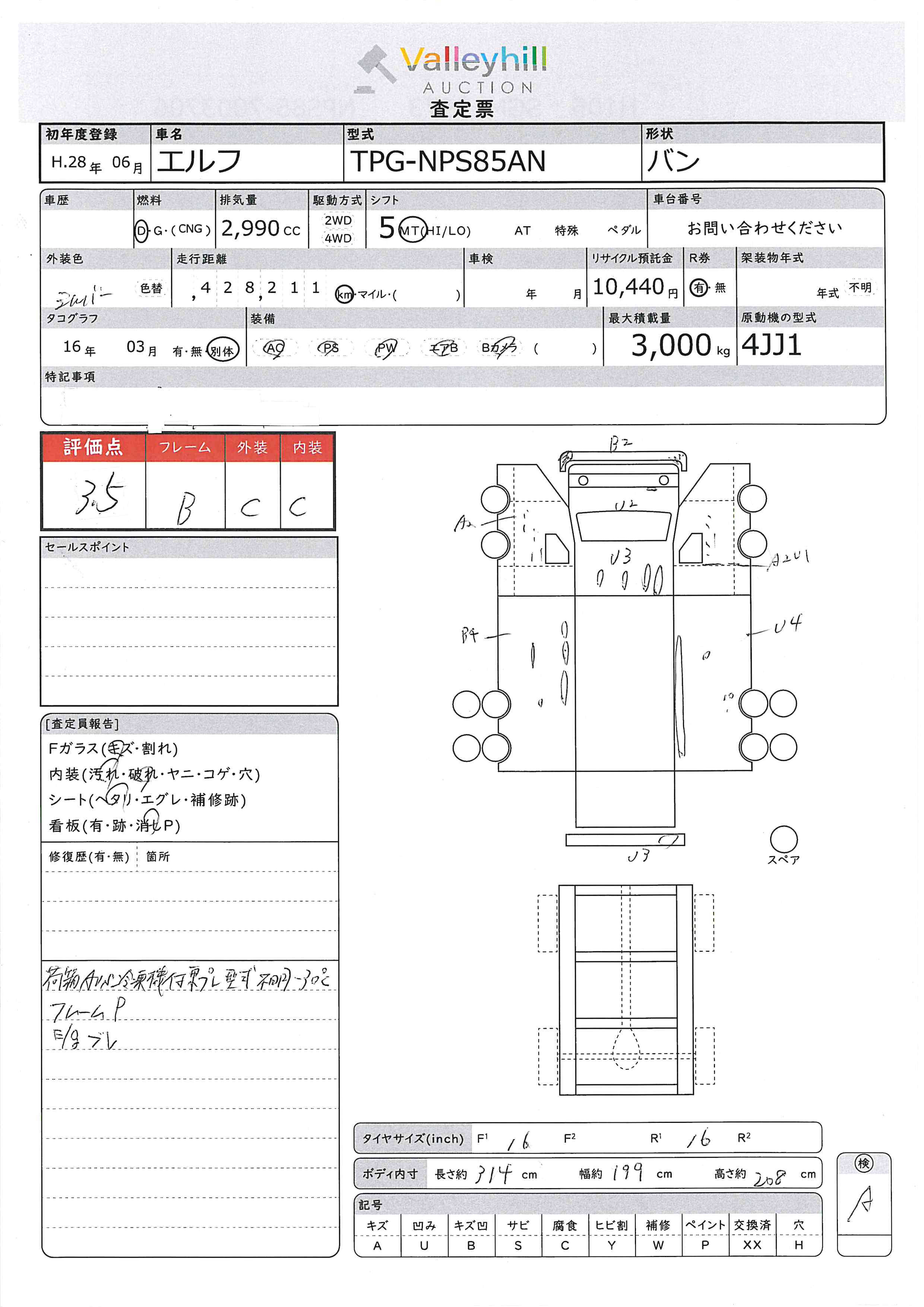 商品No. 4415 メーカー いすゞ 車名 エルフ 型式 TPG-NPS85AN 車両タイプ 小型 形状 バン 評価 3.5評価について 現状販売 - 年式 2016年 燃料 ディーゼル 排気量 2990cc 走行距離 428211km 車台番号 NPS85-700**** 原動機型式 4JJ1 トランスミッション 5MT 保管場所 ひたちなか 備考 最大積載量 3000kg 車両重量 3540kg 車両総重量 6650kg 長さ(L) 631cm 幅(W) 209cm 高さ(H) 306cm 登録年月 2024年10月 製造年度 車両状態 稼働時間 車検期限 駆動方法 4x2 ハンドル 右 タコ年式 2016年03月 タイヤサイズ前 タイヤサイズ後 外装色 シルバ- 内装色 ドア 定員 2 備考 - エアバッグ運転席
