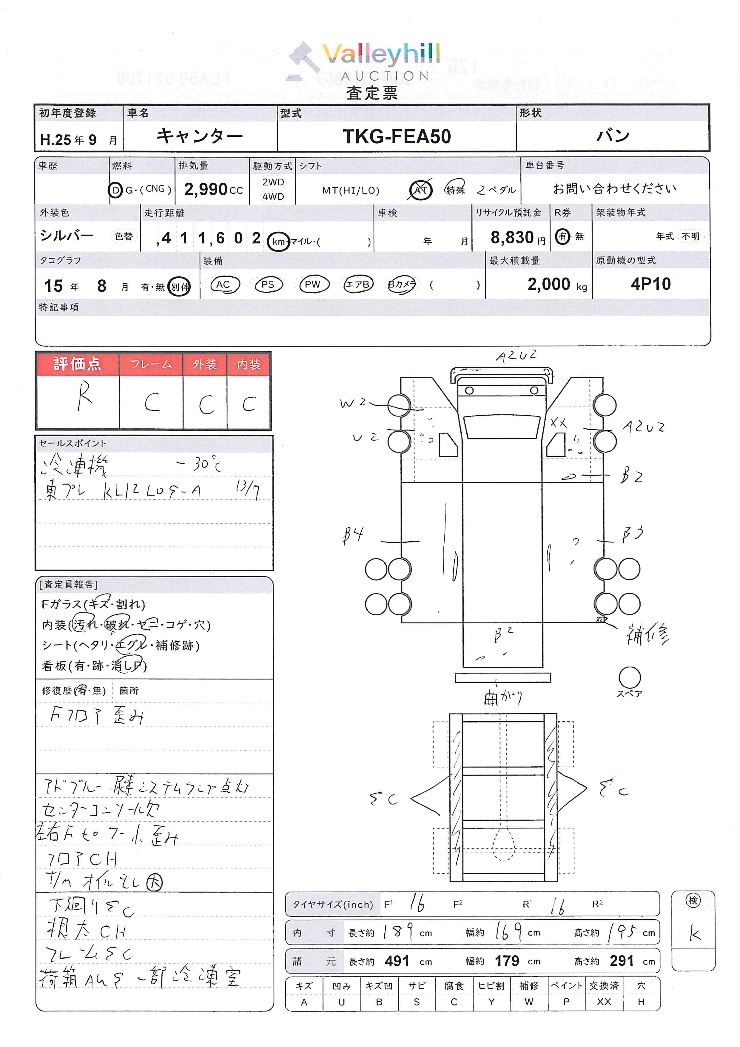 商品No. 5419 メーカー 三菱 車名 キャンター 型式 TKG-FEA50 車両タイプ 小型 形状 バン 評価 R評価について 現状販売 - 年式 2013年 燃料 ディーゼル 排気量 2990cc 走行距離 411602km 車台番号 FEA50-52**** 原動機型式 4P10 トランスミッション AT 保管場所 ひたちなか 備考 最大積載量 2000kg 車両重量 車両総重量 長さ(L) 491cm 幅(W) 179cm 高さ(H) 291cm 登録年月 製造年度 車両状態 稼働時間 車検期限 駆動方法 4x2 ハンドル 右 タコ年式 2015年08月 タイヤサイズ前 タイヤサイズ後 外装色 シルバー 内装色 ドア 定員 備考 - エアバッグ運転席