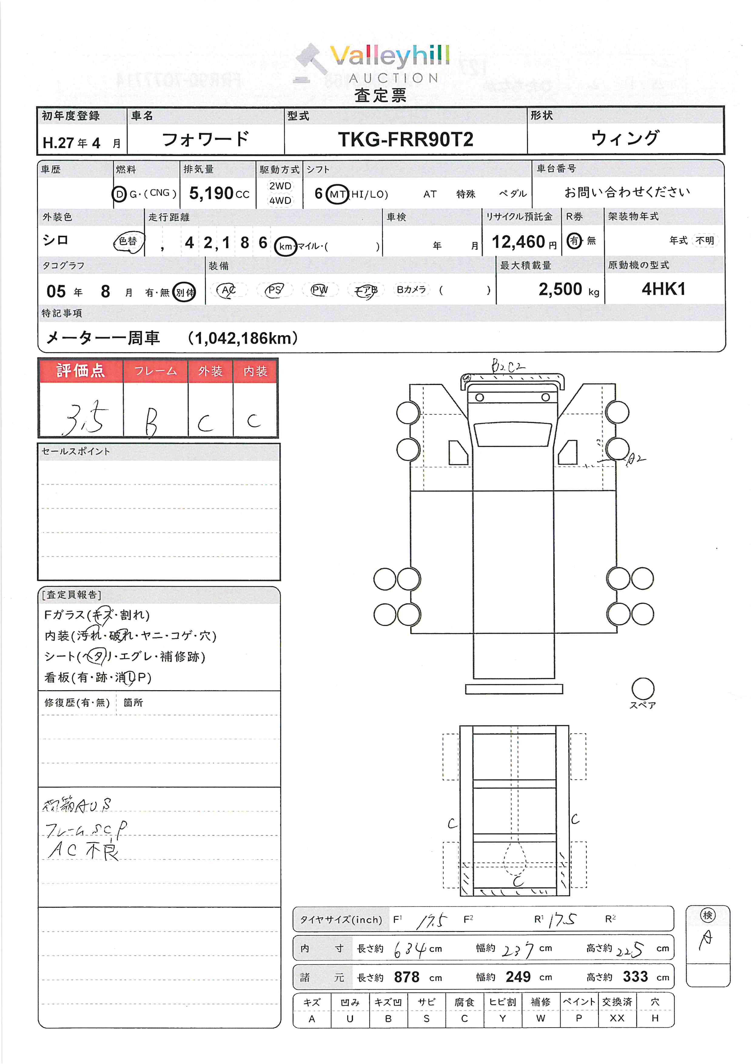 商品No. 5477 メーカー いすゞ 車名 フォワード 型式 TKG-FRR90T2 車両タイプ 大型 形状 ウイング 評価 3.5評価について 現状販売 - 年式 2015年 燃料 ディーゼル 排気量 5190cc 走行距離 42186km 車台番号 FRR90-707**** 原動機型式 4HK1 トランスミッション 6MT 保管場所 ひたちなか 備考 最大積載量 2500kg 車両重量 5380kg 車両総重量 7990kg 長さ(L) 878cm 幅(W) 249cm 高さ(H) 333cm 登録年月 2015年04月 製造年度 車両状態 稼働時間 車検期限 駆動方法 4x2 ハンドル 右 タコ年式 2005年08月 タイヤサイズ前 タイヤサイズ後 外装色 シロ 内装色 ドア 定員 2 備考 - エアバッグ運転席