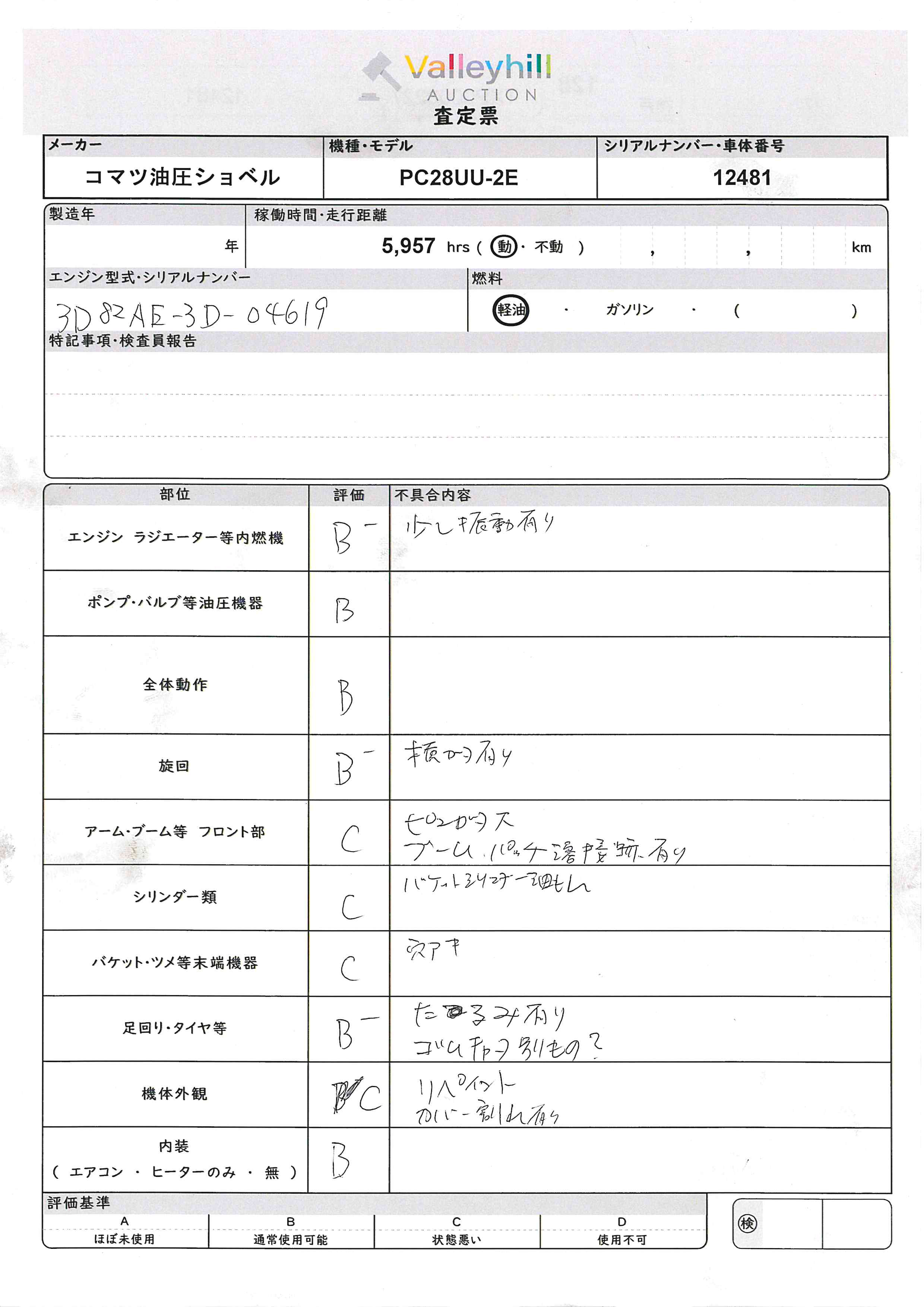 商品No. 5538 メーカー コマツ 車名 ミニ油圧ショベル 型式 PC28UU-2E 車両タイプ 中型 形状 油圧ショベル 評価 -評価について 現状販売 - 年式 0000年 燃料 ディーゼル 排気量 走行距離 5957hkm 車台番号 1**** 原動機型式 トランスミッション MT 保管場所 神戸 備考 最大積載量 車両重量 車両総重量 長さ(L) 幅(W) 高さ(H) 登録年月 製造年度 車両状態 稼働時間 車検期限 駆動方法 なし ハンドル その他 タコ年式 タイヤサイズ前 タイヤサイズ後 外装色 内装色 ドア 定員 備考